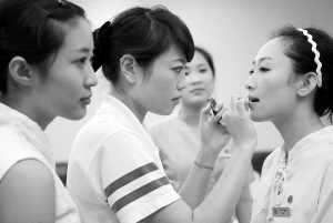 喜来登度假酒店挑选优秀员工成立了一支“国宾礼仪队”,并于 3月17日请来了专业美容师教队员们学习化妆,以最美的姿容服务2010博鳌国际旅游论坛。 本报记者 苏建强 摄
