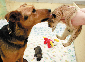 3月18日,在俄罗斯克拉斯诺亚尔斯克,狗妈妈舔两天大的狮宝宝。 在这只狮宝宝出生时,母狮和三胞胎中的其他两只都不幸死亡,因此动物园饲养员找了个狗妈妈来为它哺乳。 新华社/路透