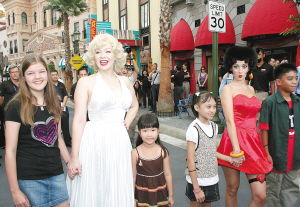 | 3月18日,在位于新加坡圣淘沙的环球影城,以玛丽莲·梦露(左二)和贝蒂娃娃(右二)造型装扮的演员带着小游客进入主题公园。 新华社记者 高川 摄 |