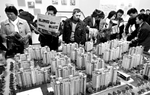 3月18日,一处本地楼盘吸引众多市民参观咨询。 当日,有“上海楼市风向标”之称的“2010上海之春房产展示交易会”在上海展览中心开幕。此次参展的国内开发商约200家,展览面积达2万平方米。在2009年底以来推出的密集调控政策影响下,本届展会首日尽管人气不减,但市场的观望气氛也悄然升温。 新华社记者 裴鑫 摄