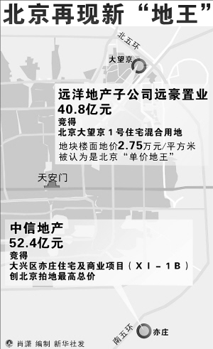 ●继远洋之后,北京中信新城房地产有限公司以52.4亿元将大兴亦庄住宅及商业项目(X1-1B)地块拿下,楼面地价超过每平方米17000元。