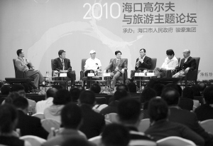 | 三月十八日下午,二○一○海口高尔夫与旅游主题论坛第二场论坛交流,六名嘉宾就《高尔夫与旅游产业》这个主题畅谈感受。本报记者 林萌 摄 |