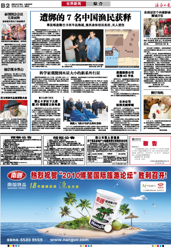 海南日报 世界新闻 010 2010-03-191 2010年03月19日 星期五