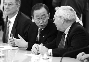 3月19日,在俄罗斯首都莫斯科外交部小别墅,联合国秘书长潘基文(中)出席中东问题有关四方代表会议。 当天的会议由英国前首相布莱尔主持,俄罗斯外长拉夫罗夫、美国国务卿希拉里、联合国秘书长潘基文及欧盟外交和安全政策高级代表凯瑟琳·阿什顿分别代表四方出席。本次会议希望对推动中东地区和平进程产生积极影响。 新华社记者鲁金博摄