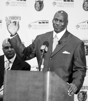 北京时间3月18日,NBA董事会一致举手通过,同意“飞人”乔丹收购夏洛特山猫队的多数股权。乔丹从当日起成为NBA史上第一位出身球员的球队大老板。图为北京时间3月19日,乔丹(右)在夏洛特举行的新闻发布会上发言。 新华社发