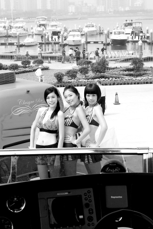 ↑ 3月19日,2010海口游艇经济主题论坛召开,部分贵宾上游艇出海试乘体验。在一艘试乘艇上,试乘模特向另一艘游艇上的客人们招手。 本报记者 林萌 摄