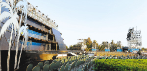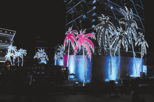 | ↑三亚亚龙湾中心广场的开幕礼晚会会场的椰树造型张扬海南特色。 本报记者 王凯 摄 |