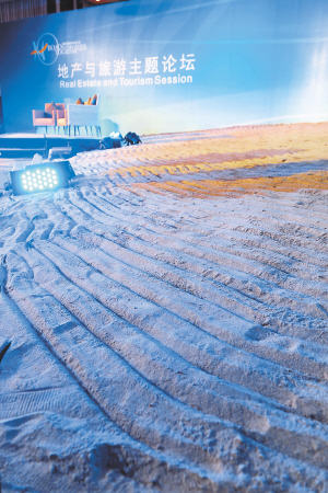 把数十吨沙拉进了室内,出现在会场的主席台上。这在海南是第一次,在全国也十分少见。这就是地产与旅游主题论坛的会场。我们知道:沙滩是大海的尽头,也是迎接人类远古文明的第一阶梯,沙滩也是大海的伙伴,如文明与文化携手并进。