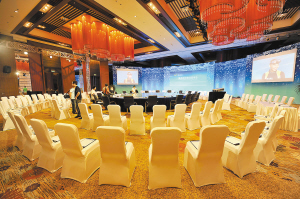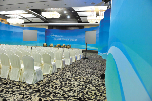 | 三亚希尔顿大酒店的地产与旅游主题论坛会场以沙滩为设计主题。 本报记者 王凯 摄 |