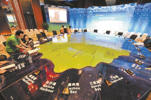 据了解,创意策划组先后论证“把会场安放在一个室内制作出的海洋上”、“让数以万计的鱼出现在会场”等做法后,从时间、节约经费角度和安全出发,最后采用了“大会背景板形成海浪,渐变的板条体现海浪的变化”“主席台用沙滩色营造出沙滩的感觉”。