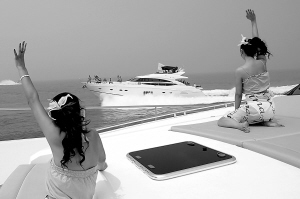 ↑ 3月19日,2010海口游艇经济主题论坛召开,部分贵宾上游艇出海试乘体验。在一艘试乘艇上,试乘模特向另一艘游艇上的客人们招手。 本报记者 林萌 摄