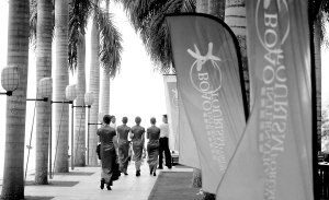 | 3月18日,三亚红树林度假酒店草坪前的通道上挂上了宣传2010博鳌国际旅游论坛的刀旗。