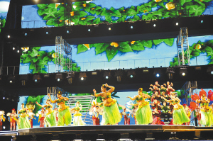 这是一场超震撼的视听盛宴!每一个节目,都有不同风格的背景画面;每一个画面,都体现了独特的海南元素。当黎明演唱《烟火》时,一对情侣骑着沙滩摩托驶上舞台,浪漫而新颖,大屏幕上出现了蓝色的房子、月亮、星星、海星、红心,动漫创意让晚会充满浪漫色彩。