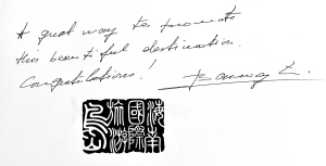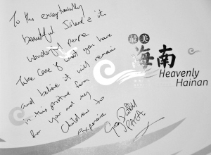 当记者捧着画册找到瑞法,他欣然同意题词,“这本画册真的很美,让人很想到实地去看看。”瑞法还为《海南日报》题词:“给《海南日报》予我最美好的祝愿。”就被助理催着离开,以致忘了签名。记者再次喊住瑞法,瑞法耸耸肩笑了,郑重地签上自己的名字。