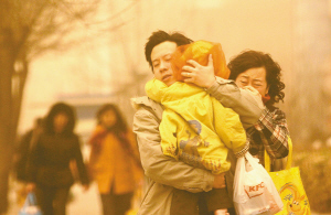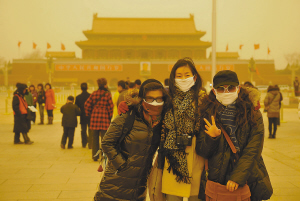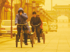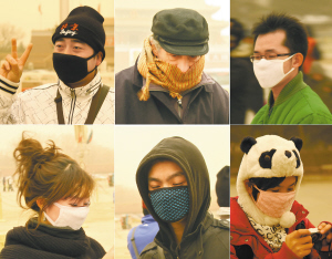 19日夜间,沙尘天气潜入北京。20日早晨,北京风沙大作、天色昏黄,室外的建筑物都蒙上了一层细细的薄沙,能见度较低,在路上行走的人们都不约而同地用围巾或口罩挡住鼻口。