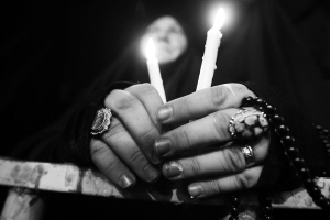 | 2009年8月7日,一名伊拉克什叶派穆斯林女子在卡尔巴拉祈祷。