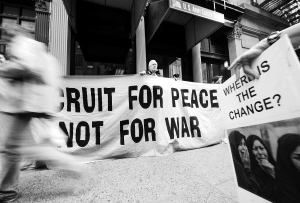 | 3月19日,反战人士在美国纽约曼哈顿岛的一家军人职业中心前集会抗议。 新华社记者申宏摄 |