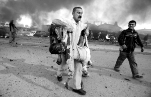 | 2007年2月18日,在伊拉克巴格达东南部地区发生的汽车炸弹爆炸现场,一名男子搬运一个男孩的尸体。