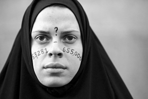 | 2007年1月11日,在美国马萨诸塞州波士顿,一名反战人士打扮成伊拉克妇女的样子参加静坐示威。他脸上的数字代表伊拉克战争中伊平民死亡人数。 新华社发 |