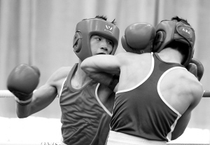 | 海南拳击选手刁剑豪(左)在二O一O年全国拳击锦标赛五十七公斤级比赛中。
