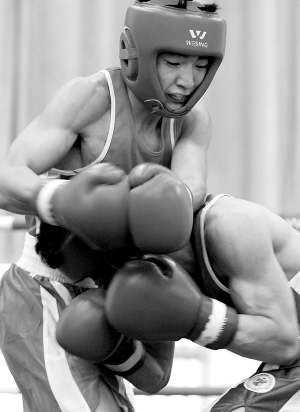 | 海南拳击选手刁剑豪(上)在比赛中。 本报记者苏晓杰摄 |