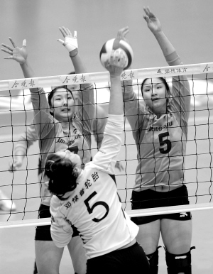 | 天津队球员殷娜(左)、杨娅男(右)在比赛中双人拦网。 新华社发 |
