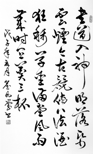 →张旭祠联 收书中堂 书道入神明,落纸云烟,今古竞传八法。酒狂称草圣,满堂风雨,岁时宜奠三杯。