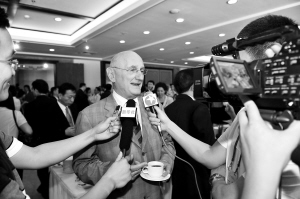 3月21日,2010博鳌国际旅游论坛大会“高端对话”环节开始前,嘉宾们被迫不及待的记者围住采访。 本报记者 王凯 摄