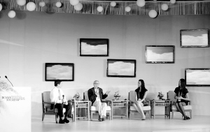 ↑ 传媒群英会———传媒与旅游主题论坛,3月20日在三亚天域度假酒店举行。图为主持人何亮亮(左一)与世界小姐奥普瑞诺(右二)、张梓琳(右一)等人进行现场交流访谈。 ← 参加“传媒群英会”的外国记者。 → 与会嘉宾李瑞英。 本版照片由本报记者 苏建强 摄
