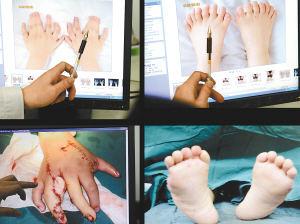 辽宁三十一指(趾)男孩 接受切除整形手术 手术前手脚照片(上排左右)与手术后手脚照片(下排左右)的对比(拼版照片)。辽宁一名6岁男孩天生多指(趾),手指脚趾加在一起共有31根。3月23日,男孩在中国医科大学附属盛京医院成功接受了手指和脚趾切除整形手术,成为与正常人一样,拥有10根手指和10根脚趾。 新华社记者 李钢 摄