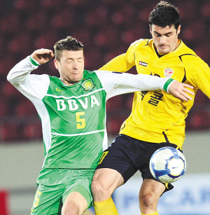 | 23日,在亚冠联赛小组赛第三轮比赛中,北京队客场以1:3不敌韩国城南队。在另一场比赛中,河南队0:2不敌韩国水原队。图为北京队马季奇(左)与对手拼抢。