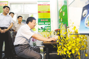 | ↑ 3月21日上午,刘云山在三亚市凤凰镇槟榔村上网,并与科技110技术人员对话。 |