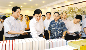 | ↑ 3月22日下午,刘云山在海南出版社考察时翻阅出版社历年出版的优秀出版物。 |