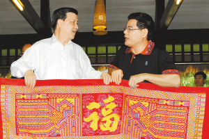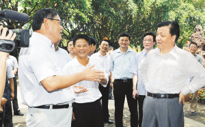 | ↑ 3月22日,刘云山在保亭黎族苗族自治县听取县委书记郑作生介绍该县文化遗产保护情况。 |