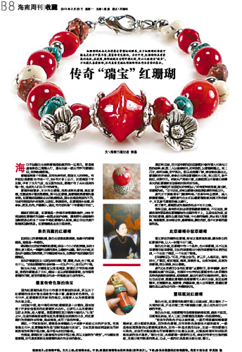 套题图片:红珊瑚手链。文内上图:红珊瑚吊坠。中图:佩戴红珊瑚饰品的宋美龄(资料图片)。下图:陈先生收藏的红珊瑚藏饰。海南日报记者 李英挺 摄