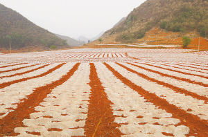在砚山县维摩彝族乡芹菜塘村旁边,大片的田地上都覆盖了一条条薄膜。维摩彝族乡乡长李辉告诉记者,这是由政府全部出资,正在推行的一个有效的抗旱措施———用塑料薄膜覆盖农作物的保水技术。将四五十公分宽的塑料薄膜铺在田埂上,灌溉一次水,水分可以保持15天。据介绍,传统种植辣椒和烟叶的维摩彝族乡可以在大旱中逐步恢复生产。