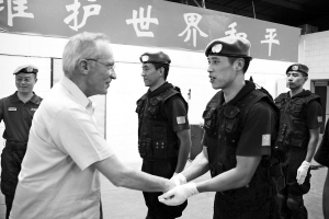 3月27日,在海地首都太子港,联合国海地稳定特派团(联海团)负责人、联合国秘书长特别代表穆莱特与中国赴海地维和警察防暴队队员握手。 当日,穆莱特视察了中国防暴队营地,向在海地地震中作出巨大贡献的中国防暴队表示赞赏和慰问。 新华社发(施金东摄)