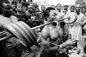 3月27日,在尼日利亚城市拉各斯,一名男子表演用嘴叼起重达50公斤的杠铃。 新华社/路透