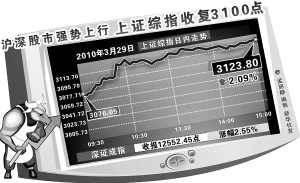 本报海口3月30日讯(记者陈平)借助上周末金交所股指期货4月16日正式推出、融资融券将在3月31日或4月1日产生第一单交易等利好消息的东风,一直以来老态龙钟的众多大盘权重股今天总算扬眉吐气了一番。上证综指在金融、煤炭及有色等资源权重品种放量走强的推动下,高开高走一路高歌猛进,相继冲上60日均线、半年线,并冲破3100点关口,最高见3130.28点,收于3123.80点,涨64.08点,涨幅2.09%;深成指收于12552.45点,涨312.09点,涨幅2.55%。深沪两市全日共成交2546亿元,较上一交易日激增三成半。
