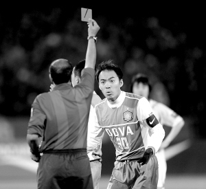 | 北京国安队球员张永海(右)被红牌罚下。 新华社发 |