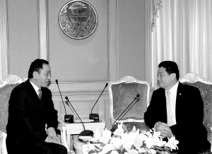 4月1日,中国驻泰国大使管木(左)在曼谷与泰国自然资源和环境部长素威·坤吉滴会谈。管木当日在曼谷说,近期湄公河水位大幅下降与中方澜沧江水电开发无关,其真正原因是当前极端干旱气候。新华社发