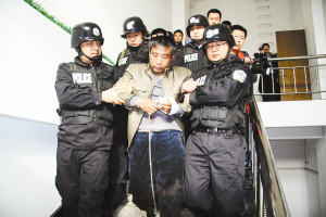 | 三月三十一日,内蒙古鄂尔多斯市公安局东胜区分局干警押送犯罪嫌疑人李焕文(前中)。