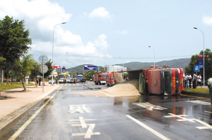据处警交警介绍,今天下午1时20分许,车牌号为琼B07599的10轮大卡车满载砂石行至田独镇镇政府路段时,驾驶员为避让前方车辆撞向路边绿化带后发生侧翻,底盘被撞变形,油箱脱落破裂并发生燃油泄漏,所载砂石也倾泻在道路上,导致交通堵塞。