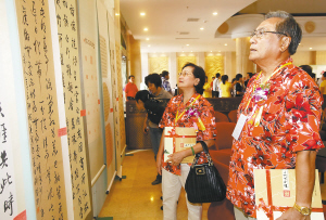 | 4月3日,几名海外华侨在观赏书画作品。当日,文昌市书画展在维嘉酒店举行,邀请来的15位省内书画家当场挥毫书写字画。 本报记者 苏晓杰 摄 |