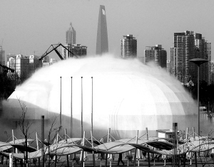 4月2日拍摄的正在调试喷雾效果的世界气象馆“云中水滴”。 近日亮相的上海世博会世界气象馆“云中水滴”,4月下旬将投入试运营。“云中水滴”以云为构思,外墙膜布设有喷雾点,喷雾开启时建筑呈现“云中水滴”效果,同时可使展馆内部降温,成为一座会“呼吸”的低碳展馆。 新华社发