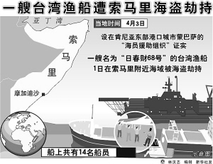 新华社内罗毕4月3日电 (记者王雅楠)设在肯尼亚东部港口城市蒙巴萨的“海员援助组织”3日证实,索马里海盗1日劫持了一艘中国台湾渔船,船上共有14名船员。