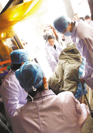 | 4月5日,一名获救矿工被送到山西省河津市人民医院接受治疗。新华社发 |