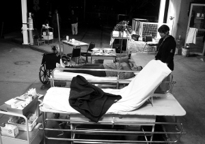 ←4月5日,在墨西哥下加利福尼亚州墨西卡利市,一名伤者在被震毁的医院外接受治疗。 新华社/路透