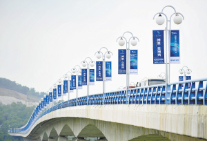 | 4月5日,通往博鳌亚洲论坛国际会议中心的万泉河大乐大桥上,论坛2010年年会的宣传广告将大桥装扮一新。 本报记者 宋国强 特约记者 王仪 摄
