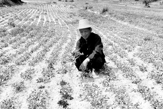 4月5日,琼海龙江镇蒙养村村民种植在滩涂上的花生大量枯死,一位村民正在查看旱情。目前琼海市受旱面积已达到9万多亩。 特约记者 蒙钟德 摄